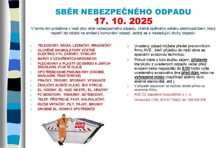SBĚR NEBEZPEČNÉHO ODPADU 17. 10. 2025 V tomto dni proběhne v naší obci sběr nebezpečného odpadu, včetně zpětného odběru elektrozařízení, který…